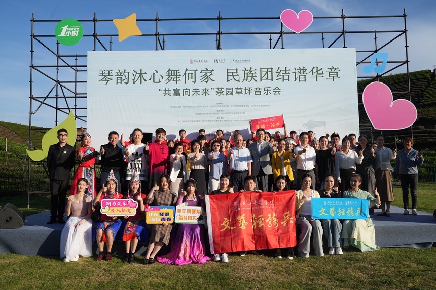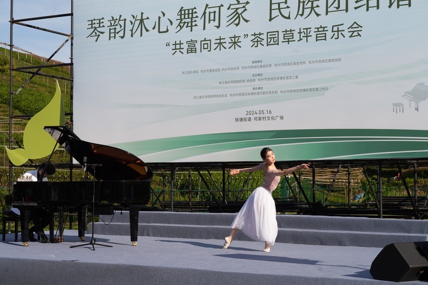 樂聲裊裊,茶香陣陣。5月16日傍晚,一場浪漫的草坪音樂會在杭州市西湖區(qū)轉(zhuǎn)塘街道何家村文化廣場拉開帷幕。來自浙江音樂學院的師生走出校園,在夕陽籠罩的茶園,為村民群眾帶來了“琴韻沐心舞何家 民族團結(jié)譜華章”——“共富向未來”茶園草坪音樂會,將高雅藝術(shù)送到村民身邊。