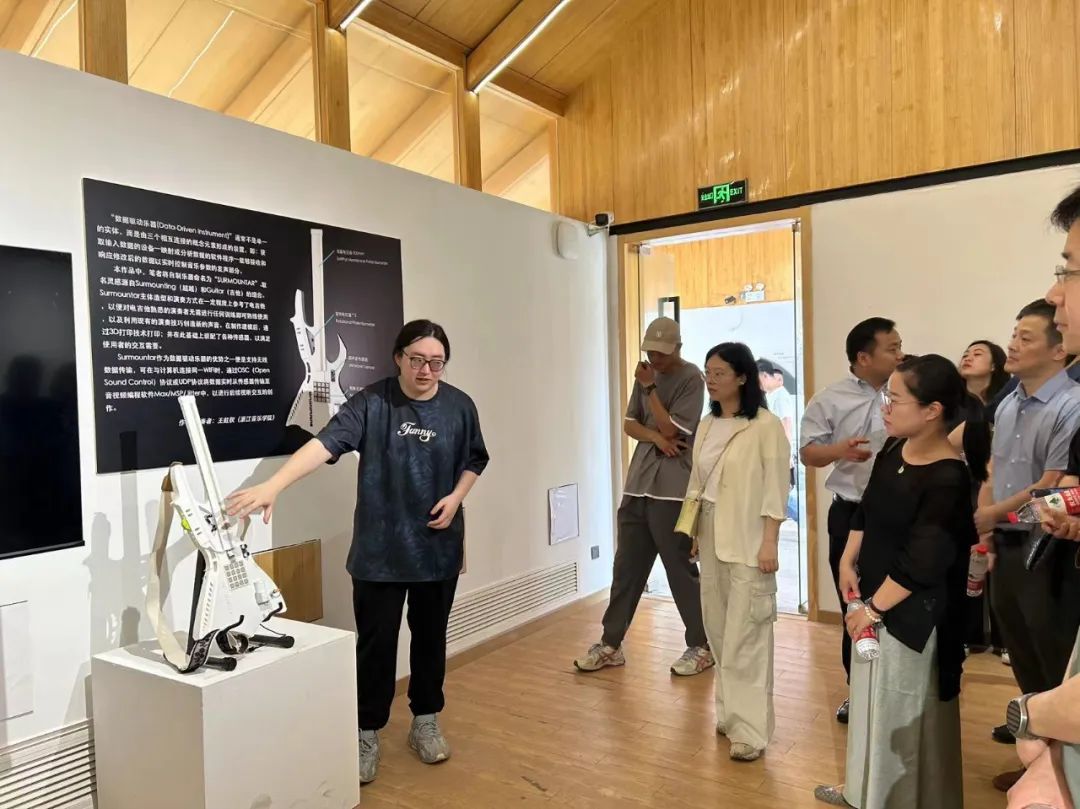 近日,浙江音樂學(xué)院音樂工程系藝術(shù)與科技畢業(yè)設(shè)計展在杭州市西湖區(qū)轉(zhuǎn)塘街道長埭村文化禮堂舉辦。面向公眾開放的展覽吸引了許多市民,在“數(shù)據(jù)驅(qū)動樂器”裝置前,一把連接了許多傳感器的3D打印吉他由演奏者通過不同手勢演奏,發(fā)出了不同的聲音,同時在電腦屏幕上顯示出與音樂形象相關(guān)的圖案,聽覺與視覺的奇妙聯(lián)動讓觀眾驚嘆不已。設(shè)計展不僅引起了社會大眾對音樂與科技新成果的好奇,也展示了浙音音樂與科技人才培養(yǎng)的優(yōu)秀成果