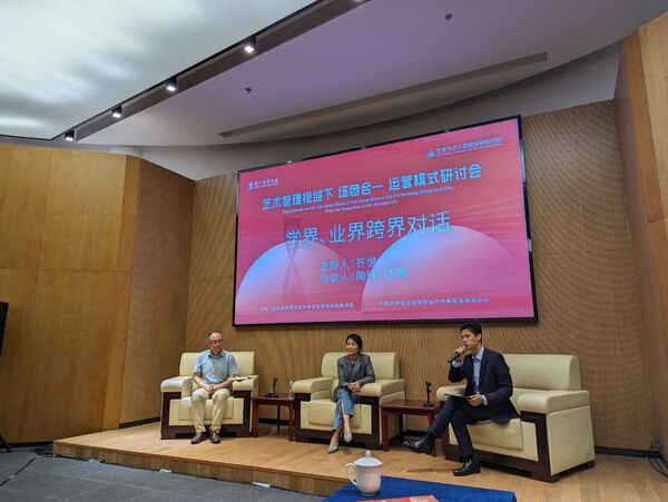 研討會(huì)現(xiàn)場(chǎng),中國(guó)人民大學(xué)藝術(shù)學(xué)院副院長(zhǎng)齊悅對(duì)話上海交響樂(lè)團(tuán)品牌總監(jiān)陸菁、浙江音樂(lè)學(xué)院藝術(shù)與文化管理高等研究院講師陶錚