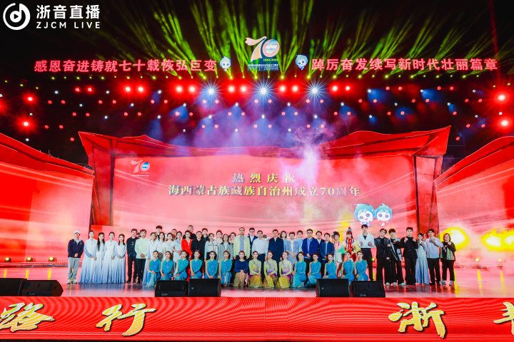 “詩畫浙江”遇上“大美青海”,攜手繪就江山錦繡;“四溢茶香”邂逅“戈壁綠洲”,共話浙青山海之情。8月6日晚,“宋韻絲路行 浙青一家親”慶祝海西蒙古族藏族自治州成立70周年文藝晚會在海西州德令哈市奧運廣場隆重上演。晚會由浙江省援青指揮部、海西州委、海西州人民政府、浙江音樂學(xué)院共同主辦。中央有關(guān)部門祝賀團、青海省黨政軍代表團、海西州四大班子領(lǐng)導(dǎo),以及浙江音樂學(xué)院相關(guān)領(lǐng)導(dǎo)出席并觀看晚會。晚會現(xiàn)場16000余名海西州群眾觀看演出,人民日報、中國藍等20余家媒體平臺進行直播,線上累計觀看人數(shù)超過880萬。