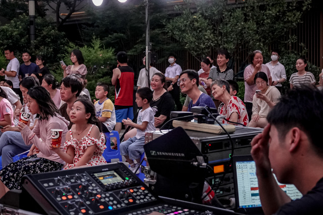 一曲原創(chuàng)的《綠風(fēng)》悠揚(yáng)開場(chǎng),在琴聲與詩(shī)意的交織中,現(xiàn)場(chǎng)的市民游客側(cè)耳聆聽、沉醉其中,用星星點(diǎn)點(diǎn)的閃光燈連成夏夜最美的背景。走過的路人也紛紛停下來,打卡拍照。當(dāng)晚還特別加入了《大魚》《起風(fēng)了》《生生世世愛》等膾炙人口的新國(guó)樂曲目。這些曲目在專業(yè)的民樂演出中并不常見,是樂團(tuán)特別為這場(chǎng)音樂會(huì)編排的。