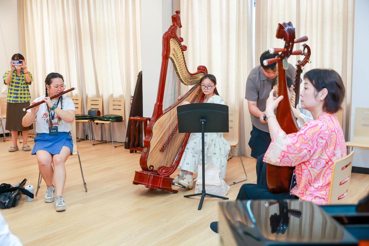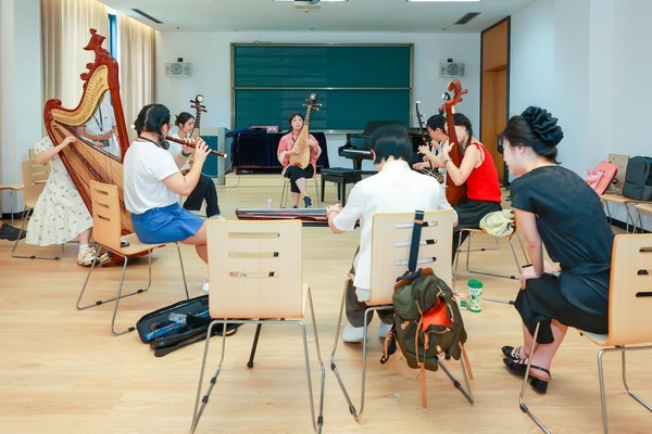在排練室里圍坐一圈,從吳蠻右手邊的學(xué)員開(kāi)始自我介紹。因?yàn)槭敲駱?lè)小組,其中5個(gè)學(xué)員來(lái)自國(guó)內(nèi)遼寧、湖南、浙江等地,還有一位來(lái)自美國(guó)。三個(gè)人拿的是琵琶,還有一架箜篌、一架古琴、一管笛子。他們要在吳蠻的指導(dǎo)下,排出一個(gè)節(jié)目,在四天后的音樂(lè)會(huì)上演奏。