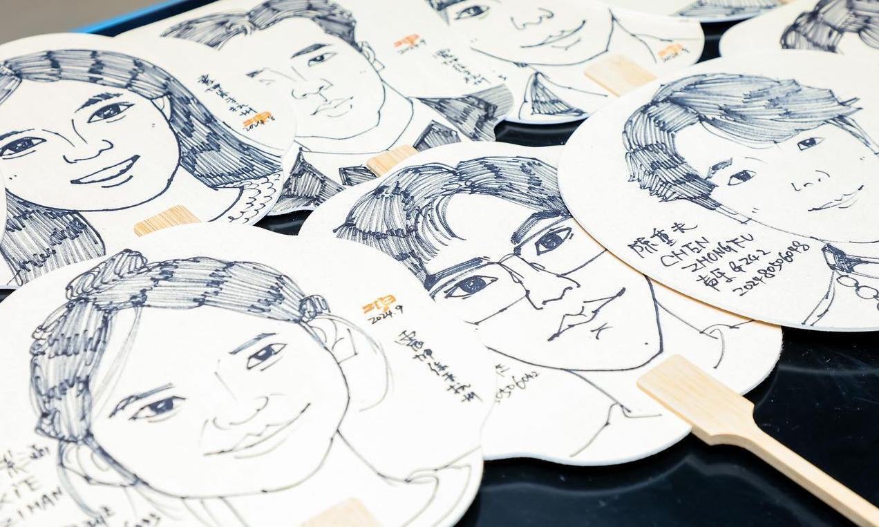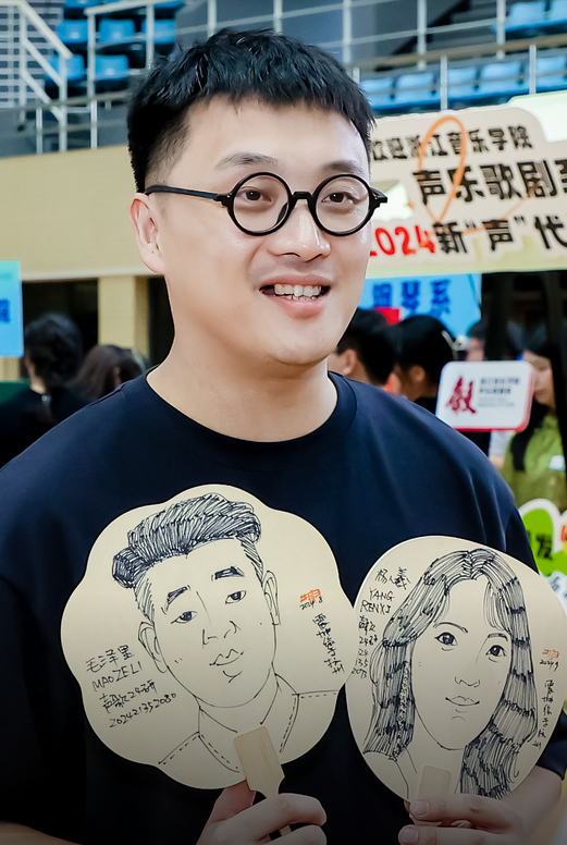 在聲樂(lè)歌劇系的報(bào)到點(diǎn)前,記者發(fā)現(xiàn),每個(gè)學(xué)生手里都拿著一把扇子,上面畫(huà)著學(xué)生的頭像,這些人像出自聲歌系輔導(dǎo)員田震坤之手。