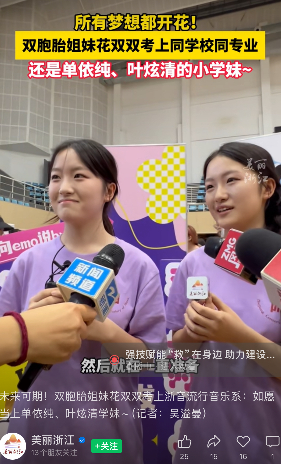 美麗浙江:未來可期!雙胞胎姐妹花雙雙考上浙音流行音樂系:如愿當(dāng)上單依純、葉炫清學(xué)妹~