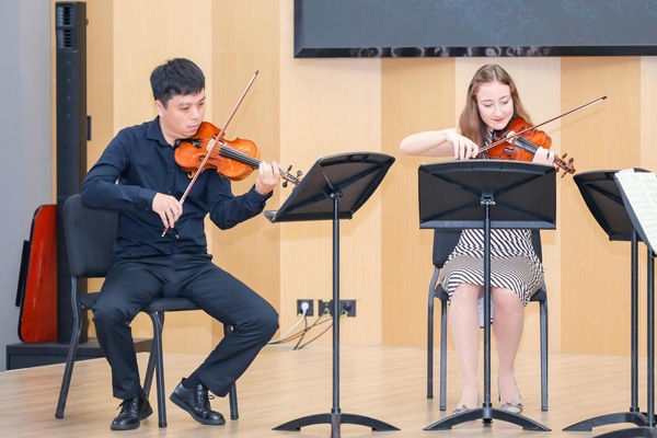 外面是淅瀝的雨,九月下旬的天氣,因?yàn)榕_(tái)風(fēng)欲來而有些潮濕。浙江音樂學(xué)院教師發(fā)展中心的小舞臺(tái)上,傳出活潑歡快提琴聲,跳躍的音符,仿佛把人帶到陽光下的草地,呼吸一口爽快的干燥空氣。