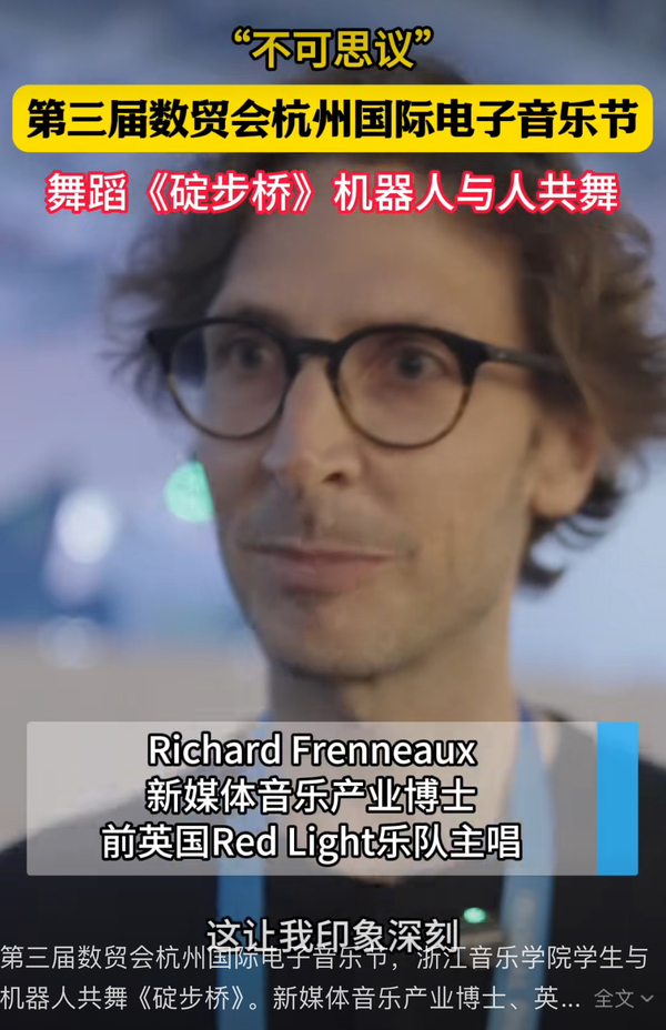 中國藍國際:第三屆數(shù)貿(mào)會杭州國際電子音樂節(jié),浙江音樂學院學生與機器人共舞《碇步橋》。新媒體音樂產(chǎn)業(yè)博士、英國Right Red樂隊前主唱Richard Frenneaux 看后覺得: 不可思議。