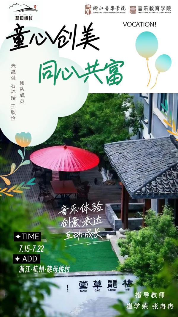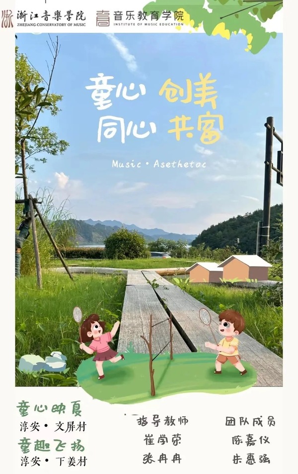 7月8日至22日,由浙江音樂學(xué)院音樂教育學(xué)院在杭州市慈母橋村和淳安縣的文屏村及下姜村開展的“童心創(chuàng)美·同心共富”主題實(shí)踐活動(dòng),為鄉(xiāng)村振興注入了新的活力。實(shí)踐活動(dòng)以“美育”為核心,以“創(chuàng)造”為動(dòng)力,通過全方位、多感官、多層次的沉浸式美育創(chuàng)意實(shí)踐活動(dòng),豐富兒童的精神世界、提升兒童的綜合素養(yǎng)。這一舉措不僅是“精神富有”從理論到實(shí)踐應(yīng)用的有益探索,更是解碼浙江音樂學(xué)院音樂教育學(xué)院攜手慈母橋村、文屏村、下姜村“共富理念”的重要體現(xiàn)。
