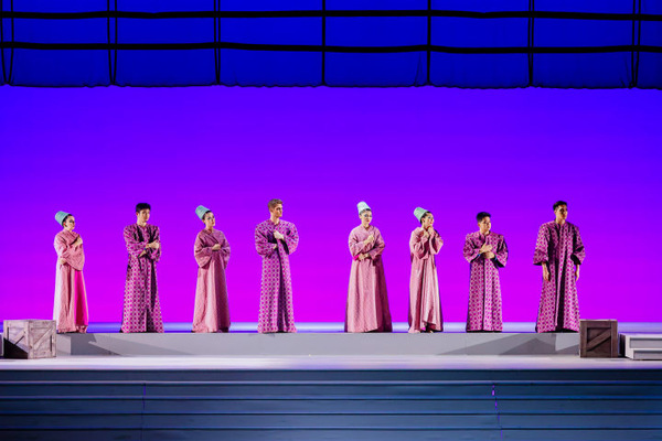 與傳統(tǒng)歌劇相比,《馬可·波羅》呈現(xiàn)出鮮明的現(xiàn)代歌劇特征。這部歌劇創(chuàng)新性地在舞臺(tái)上運(yùn)用了八聲部合唱,除了營(yíng)造游吟傳說(shuō)般的氛圍外,還能精巧烘托主角的內(nèi)心活動(dòng);在交響樂(lè)隊(duì)中,加入了十六世紀(jì)歐洲流行的古代樂(lè)器雙頸詩(shī)琴,營(yíng)造出古韻十足的藝術(shù)氛圍,還加入了極少在歌劇中出現(xiàn)的電吉他,讓整場(chǎng)演奏具有更為豐富的表現(xiàn)力;舞美則突出了現(xiàn)代藝術(shù)的特色,道具與背景精巧簡(jiǎn)潔,配合演員的肢體表演,延展出豐富的藝術(shù)內(nèi)涵;服裝設(shè)計(jì)師也用富有現(xiàn)代審美的色彩,展現(xiàn)出“西方人想象中的中國(guó)古代服飾”,為歌劇增添了異域風(fēng)情與傳奇魅力。