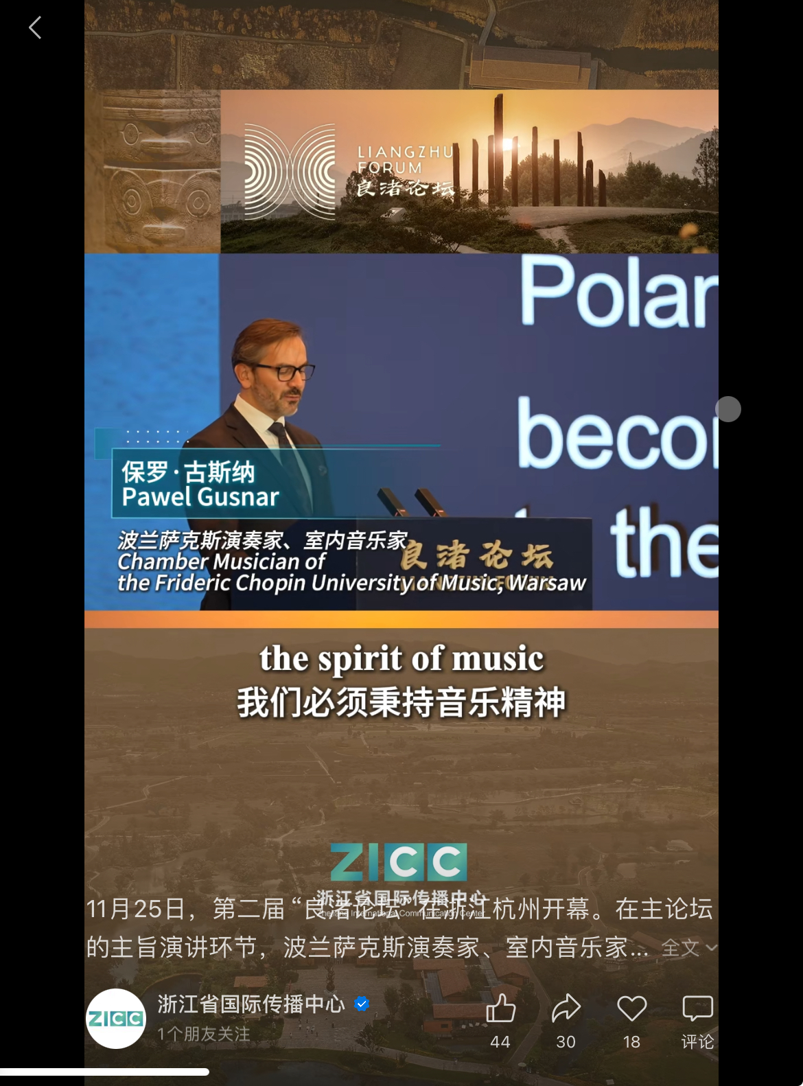 11月25日,第二屆“良渚論壇”在浙江杭州開幕。在主論壇的主旨演講環(huán)節(jié),波蘭薩克斯演奏家、室內(nèi)音樂家保羅·古斯納(Pawel Gusnar)講述了傳統(tǒng)與現(xiàn)代音樂的關(guān)系、以及他對人工智能與藝術(shù)創(chuàng)作的理解。The Second Liangzhu Forum opened in Hangzhou, Zhejiang province, on Nov 25. During the keynote speech session of the main forum, Pawel Gusnar, chamber musician of the Frideric Chopin University of Music, Warsaw, discussed the relationship between traditional and modern music, as well as his perspectives on artificial intelligence and artistic creation.
