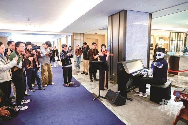 會(huì)場(chǎng)上,一首《梁祝》吸引了在場(chǎng)嘉賓的目光。這是由浙江音樂(lè)學(xué)院的小提琴手與浙江大學(xué)研發(fā)的機(jī)器人樂(lè)隊(duì)攜手創(chuàng)作,“鋼琴老師”熟練的指法,讓在場(chǎng)的嘉賓們充滿了好奇心。