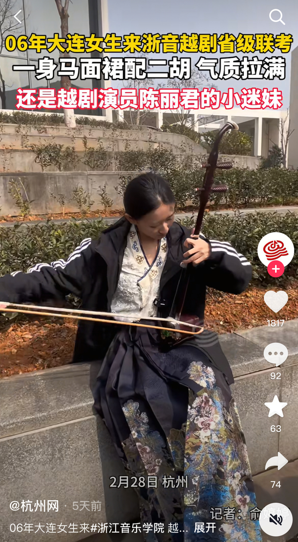杭州網(wǎng):06年大連女生來浙江音樂學(xué)院越劇省級(jí)聯(lián)考,一身馬面裙配二胡,氣質(zhì)拉滿!還是越劇演員陳麗君的小迷妹