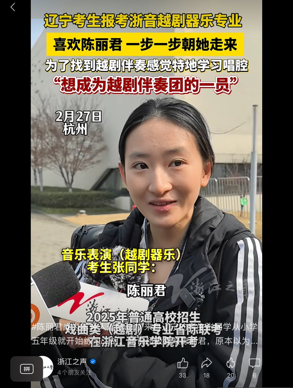 浙江之聲:#陳麗君成為年輕人追夢動(dòng)力 來自遼寧的考生張同學(xué)從小學(xué)五年級就開始練習(xí)二胡。她說超級喜歡陳麗君,原本以為遙不可及,但如果努力考進(jìn)浙江音樂學(xué)院,就能離她更近一步。#陳麗君#越劇