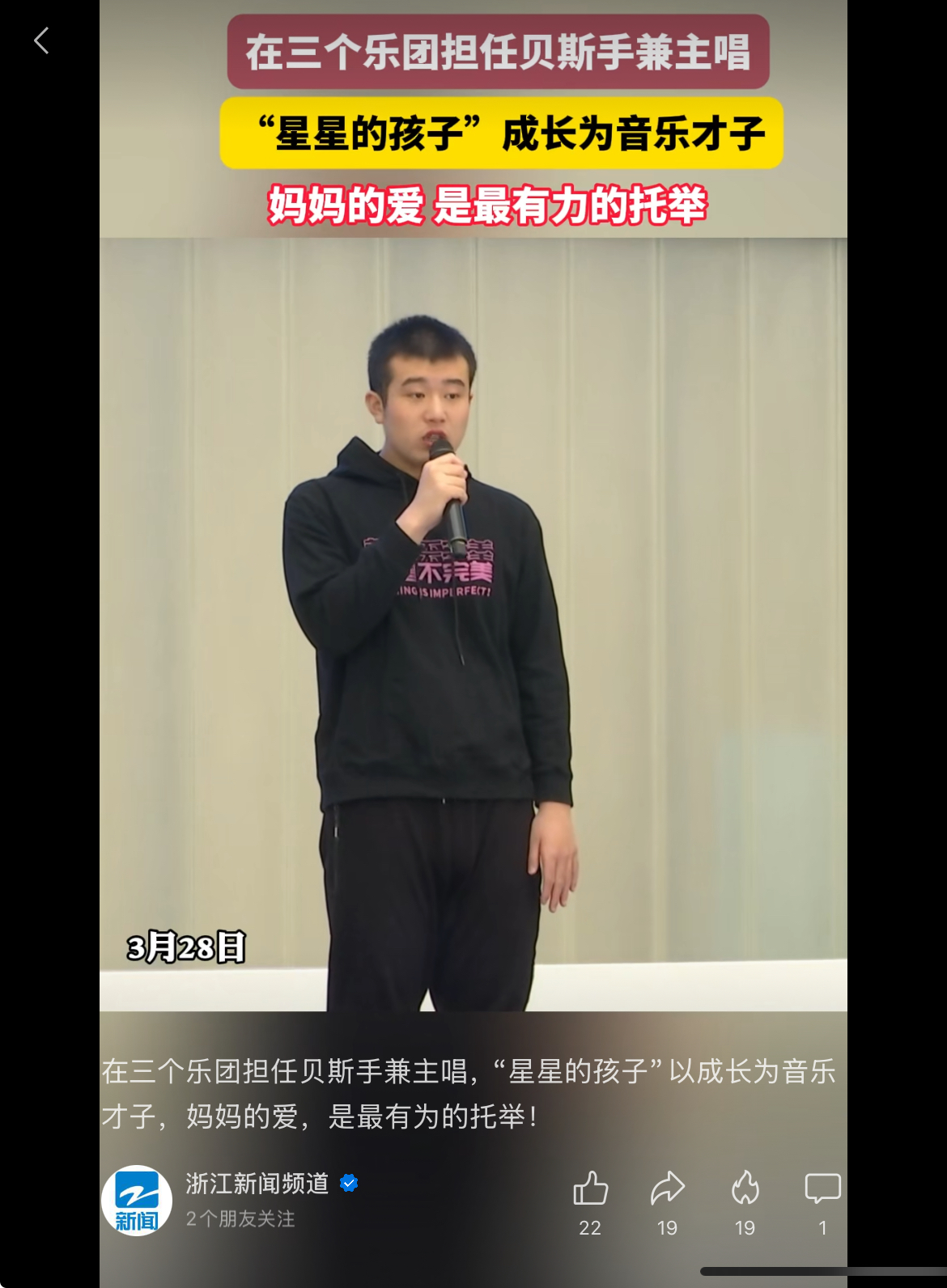 浙江新聞?lì)l道:在三個(gè)樂(lè)團(tuán)擔(dān)任貝斯手兼主唱,“星星的孩子”以成長(zhǎng)為音樂(lè)才子,媽媽的愛(ài),是最有為的托舉!