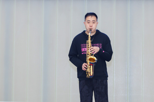 “現(xiàn)在,音樂(lè)會(huì)進(jìn)入第三篇章:未來(lái)。接下來(lái),有請(qǐng)來(lái)自大喇叭特殊兒童關(guān)愛(ài)中心的家銘為大家演奏薩克斯《The One You Love》(《你愛(ài)的那個(gè)人》)。”這個(gè)聽(tīng)起來(lái)有些生澀但有力的聲音,來(lái)自大喇叭的孤獨(dú)癥兒童凌凌。在這場(chǎng)音樂(lè)會(huì)中,多才多藝的凌凌一人分飾三角——主持人、非洲鼓手、手風(fēng)琴獨(dú)奏。