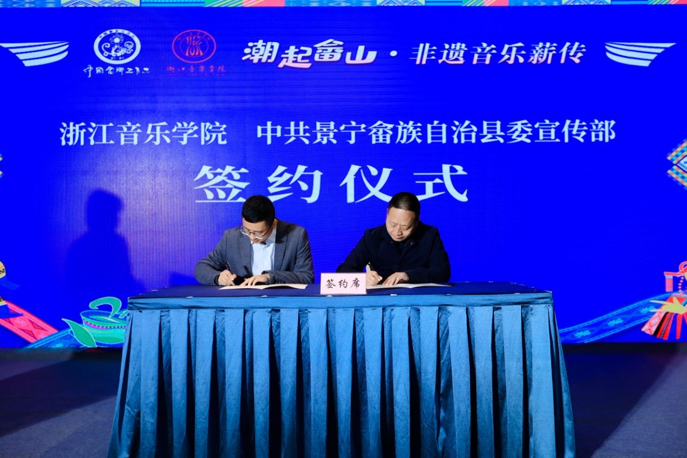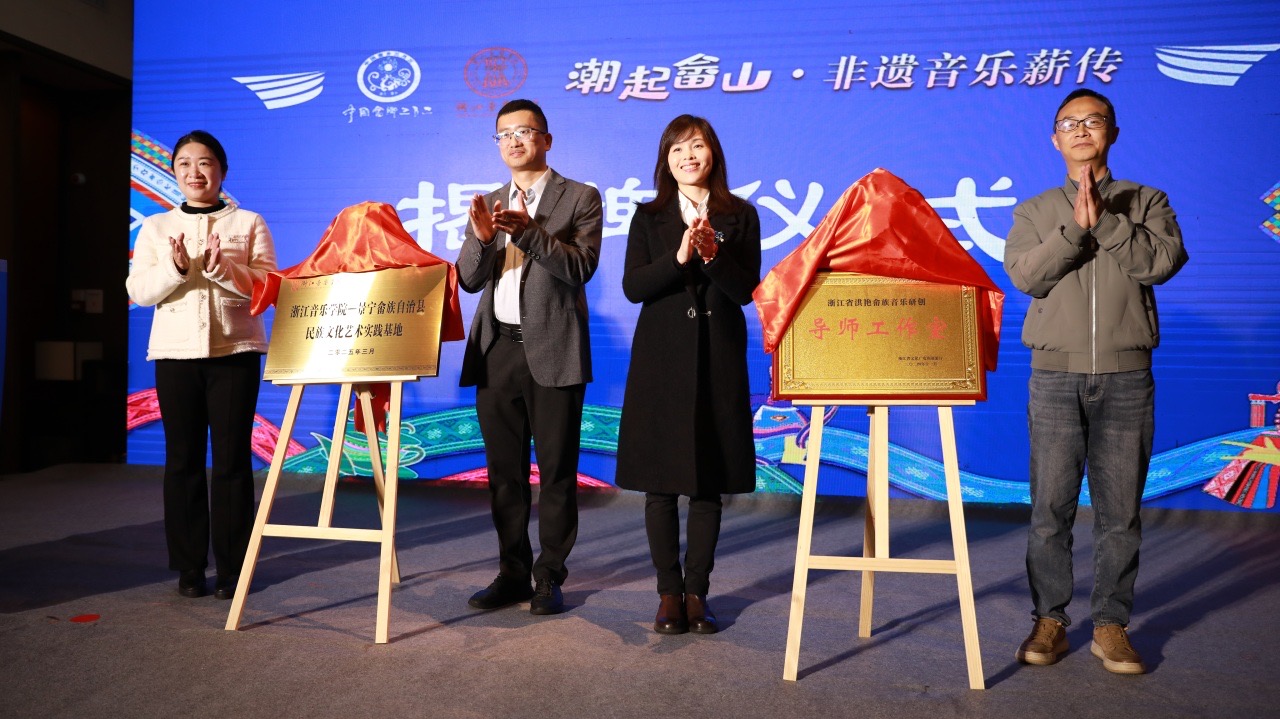 活動現(xiàn)場,浙江音樂學(xué)院與縣委宣傳部簽署了《“守藝計劃”畬族非遺青年人才培育實踐與研究》橫向課題合作協(xié)議,并掛牌成立“浙江省音樂學(xué)院—景寧畬族自治縣民族文化藝術(shù)實踐基地”及“洪艷畬族音樂創(chuàng)研工作室”。此后將依托高校學(xué)術(shù)資源與地方文化底蘊,系統(tǒng)性開展畬族音樂的研究、創(chuàng)作與傳播?;顒蝇F(xiàn)場還為學(xué)術(shù)顧問、特聘專家及非遺傳承導(dǎo)師頒發(fā)聘書,并通過發(fā)布“畬守藝·π計劃”促成導(dǎo)師與畬族非遺青年人才結(jié)對,為畬族非遺活態(tài)傳承注入新生力量。