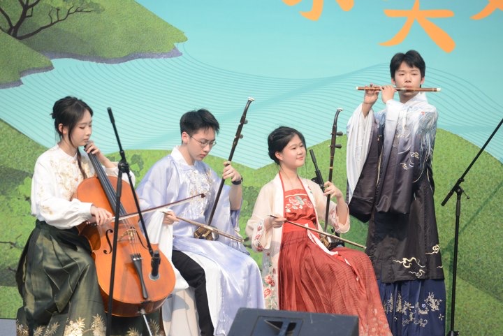 露天舞臺(tái)與茶田暮色相映成趣,浙江音樂學(xué)院師生組成的“文藝輕騎兵”和當(dāng)?shù)卮迕窆餐桥_(tái),為觀眾帶來民樂、舞蹈、戲劇等精彩節(jié)目,讓大家在茶田新韻的獨(dú)特旋律中真切感受藝術(shù)與自然的共鳴。這場(chǎng)“沒有邊界的演出”讓藝術(shù)從劇場(chǎng)舞臺(tái)流向廣袤天地,展現(xiàn)了新時(shí)代文藝青年與鄉(xiāng)村的藝術(shù)碰撞,為美麗鄉(xiāng)村賦予鮮活的藝術(shù)魅力。