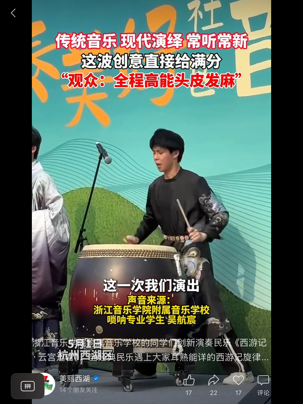 美麗西湖:浙江音樂學(xué)院附屬音樂學(xué)校的同學(xué)們創(chuàng)新演奏民樂《西游記·云宮迅音》。當(dāng)經(jīng)典民樂遇上大家耳熟能詳?shù)奈饔斡浶?,?huì)有怎樣奇妙的化學(xué)反應(yīng)呢?