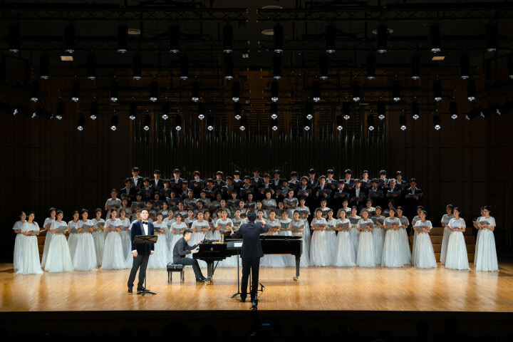 女高音獨唱《西湖春》以杭州西湖春日為靈感,以江南民歌、越劇風韻點染水墨江南,聲樂歌劇系教師許紅霞的演唱空靈婉轉,將江南水鄉(xiāng)的柔美與生機娓娓道來。首演的男女聲二重唱《靜夜思》則以李白同名詩為詞,突破了西洋曲式創(chuàng)作手法,吸收民間戲曲與古典音樂特點,聲樂歌劇系教師范雙燕、方遠清亮且低沉的嗓音,織就了游子月下懷鄉(xiāng)的東方意境?;ㄇ慌咭舄毘缎▲B,我的朋友》創(chuàng)作于1984年。音樂教育學院教師盧思嘉的演繹輕盈靈動、極富張力,以花腔華彩樂段摹寫小鳥的自然靈韻。女高音獨唱《馬鈴聲聲響》創(chuàng)作于施光南與夫人戀愛結婚前后,聲樂歌劇系教師李佳蔚以清新質(zhì)樸的歌聲,勾勒出知識青年返鄉(xiāng)途中的豐收景象,抒發(fā)對時代變遷與祖國山河的贊美之情。男女聲三重唱《橘頌》選自歌劇《屈原》,作為施光南先生傾注心血的未竟之作,聲樂歌劇系教師劉偉、劉濤、虞曉曦的演唱深沉厚重,既展現(xiàn)了歌劇的宏大氣勢,亦成為作曲家一生奉獻音樂的生動寫照。小提琴獨奏曲《瑞麗江邊》創(chuàng)作于1963年,汲取了云南民歌音調(diào),管弦系教師錢寅斌的演奏將施光南先生少年時期的創(chuàng)作才情與對民族音樂的深厚功底展現(xiàn)得淋漓盡致。弦樂四重奏《青春》是施光南先生在天津音樂學院求學時期的作品,由管弦系學生組成的四重奏默契配合,以躍動音符鐫刻少年哲思。首演的合唱組曲《在祖國大家庭里》之《藍天上飛過的跑馬云》以蒙古族長調(diào)元素為核心,劉濤的演唱與浙音合唱學院的多彩和聲相互呼應,勾勒出遼闊草原的悠遠意境,彰顯了施光南先生在少數(shù)民族音樂創(chuàng)作領域的深耕。