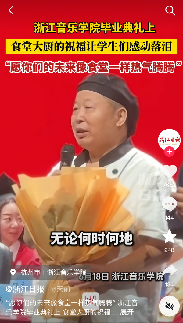 浙江日報(bào):“愿你們的未來像食堂一樣熱氣騰騰” 浙江音樂學(xué)院畢業(yè)典禮上 食堂大廚的祝福讓學(xué)生感動(dòng)落淚
