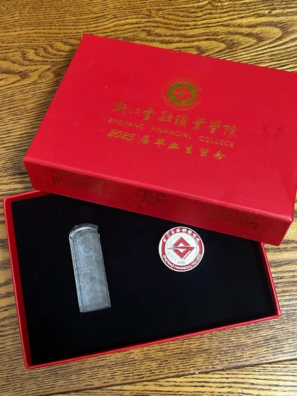 浙江金融職業(yè)學(xué)院給每位畢業(yè)生準(zhǔn)備了一份特別的禮物——“金院印記”。里面有一枚刻著名字的印章,印章側(cè)面是校訓(xùn)“披沙揀金,融會貫通”,旁邊還有一枚校徽胸針,閃著熟悉的光。