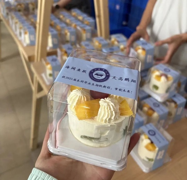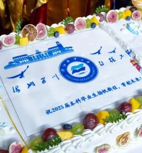 浙江海洋大學(xué)在畢業(yè)典禮當(dāng)天為每一位畢業(yè)生準(zhǔn)備了一份定制祝福蛋糕,并為當(dāng)天生日的畢業(yè)生們送上了特別的“生辰之禧”——精心制作的巨型祝福蛋糕。