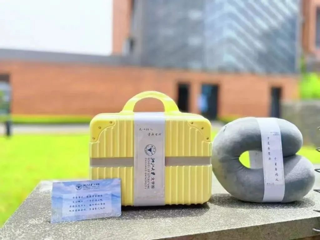 浙江大學(xué)文學(xué)院為畢業(yè)生們準(zhǔn)備了手提行李箱,用它裝滿夢想,奔赴遠(yuǎn)方;還有灰色U型枕,讓它伴學(xué)子旅途,安然入夢。