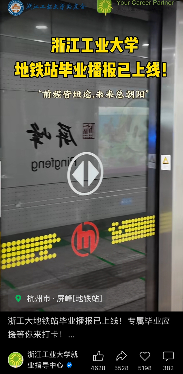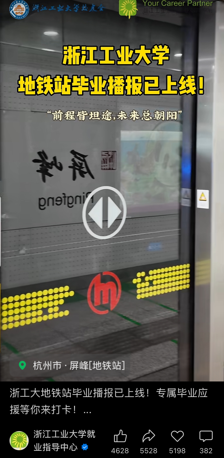 浙江工業(yè)大學(xué)地鐵站上線專屬畢業(yè)播報,祝每一位畢業(yè)生“前程皆坦途,未來總朝陽,此去乘風(fēng)破浪,萬里鵬程起航”。