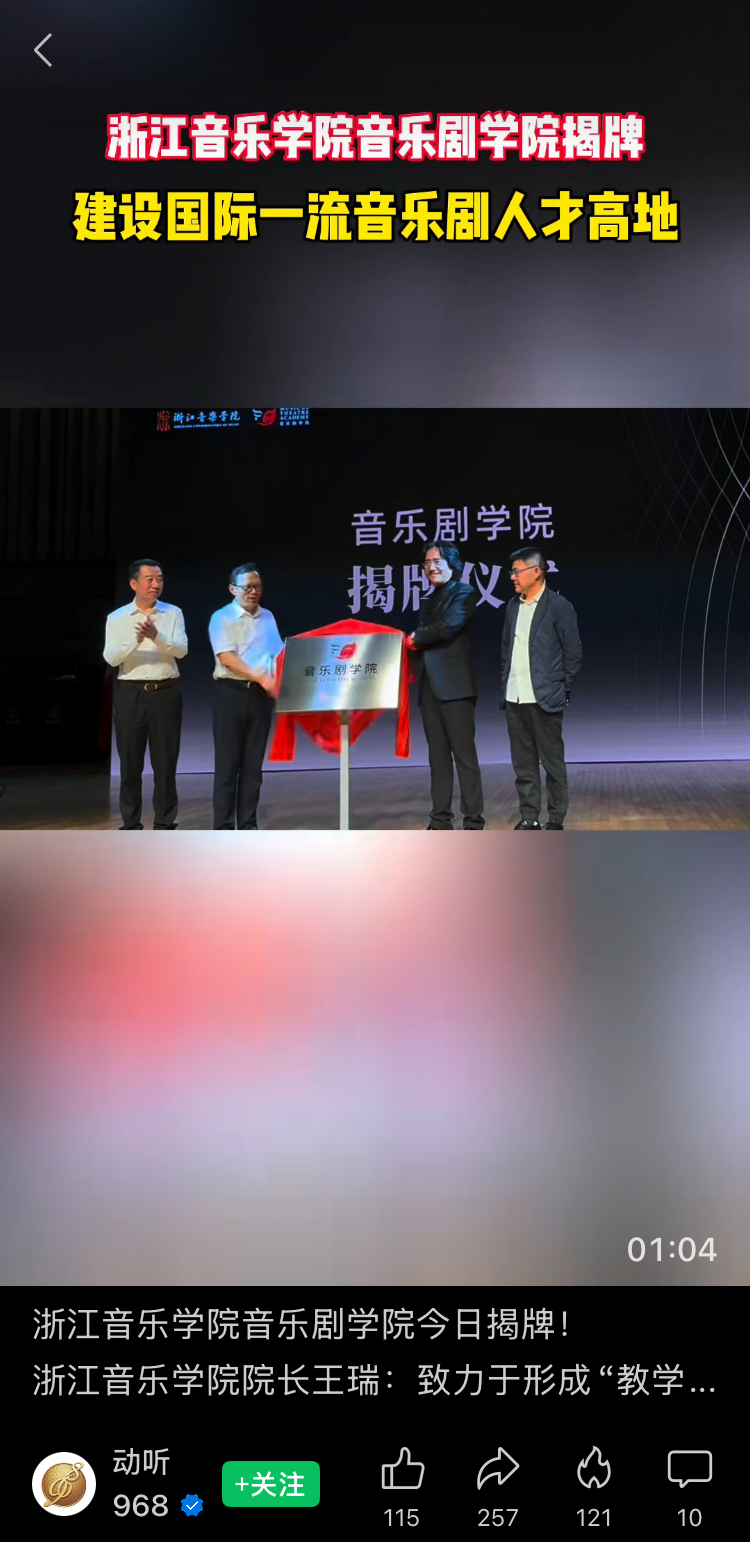 動聽968: 浙江音樂學院音樂劇學院今日揭牌! 浙江音樂學院院長王瑞:致力于形成“教學、創(chuàng)作、演出、研究、產(chǎn)業(yè)”五位一體的新型發(fā)展模式,建設國際一流音樂劇人才高地。#浙江音樂學院 #音樂劇學院