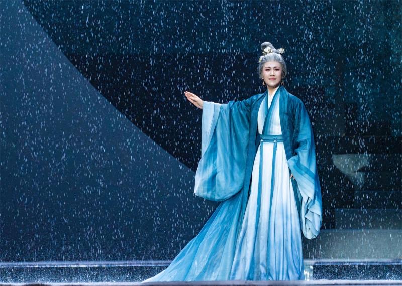 民族歌劇《李清照》不僅是對(duì)一位著名歷史人物的藝術(shù)再現(xiàn),也是對(duì)宋韻文化的一次深入挖掘與展現(xiàn),除了獨(dú)特的創(chuàng)作角度,濃濃的宋韻彌漫全劇。該劇主創(chuàng)團(tuán)隊(duì)深度挖掘宋韻文化,在舞美、音樂(lè)、服飾等維度打造“流動(dòng)的宋畫(huà)”。舞美設(shè)計(jì)裘冰以中央雨幕為核心意象,配合燈光投影的虛實(shí)變化,時(shí)而化作“梧桐更兼細(xì)雨”的江南愁緒,時(shí)而變?yōu)?ldquo;不肯過(guò)江東”的歷史烽煙;服裝設(shè)計(jì)以莫蘭迪色系搭配絲綃綢緞,再現(xiàn)宋代極簡(jiǎn)雅致的審美。