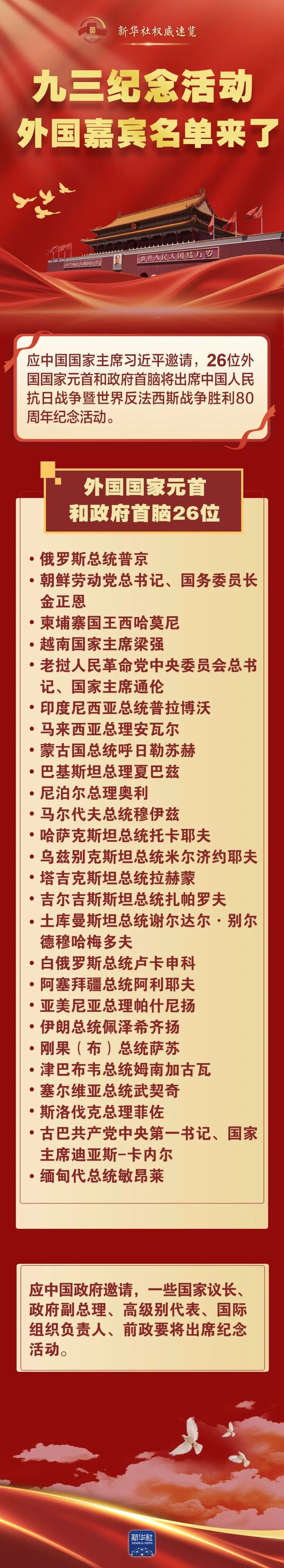 應(yīng)中國國家主席習(xí)近平邀請,26位外國國家元首和政府首腦將出席中國人民抗日戰(zhàn)爭暨世界反法西斯戰(zhàn)爭勝利80周年紀(jì)念活動。他們是: