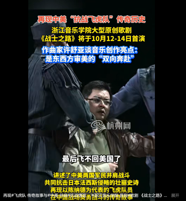 杭州網(wǎng)教育:再現(xiàn)飛虎隊(duì)傳奇故事與中美并肩抗戰(zhàn)情誼,浙江音樂學(xué)院原創(chuàng)歌劇《戰(zhàn)士之路》明起首演 #紀(jì)念抗戰(zhàn)勝利80周年