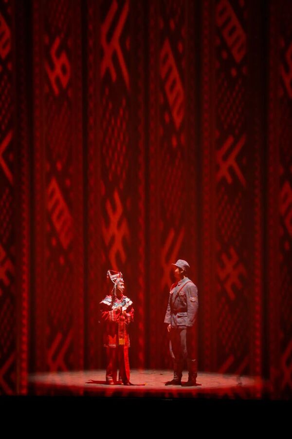 燈光漸暗,音樂響起。音樂劇在洋溢著濃郁畬族風(fēng)情的歌曲《歡慶三月三》中開場,瞬間將觀眾帶入那個風(fēng)情淳樸又命運交織的左溪村。舞臺之上,1944年烽火連天的泰順山鄉(xiāng)與2025年寧靜現(xiàn)代的時空,通過精巧的舞美設(shè)計和敘事結(jié)構(gòu),交錯并行。