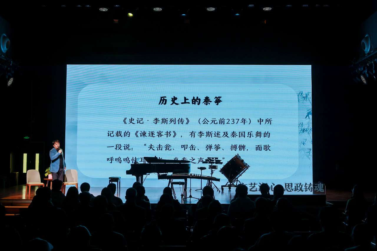 藝術(shù)思政導(dǎo)師周展帶領(lǐng)“翡翠箏團(tuán)”現(xiàn)場(chǎng)演繹了《姜女淚》《秦土情》《白桐曲——為紀(jì)念焦裕祿而作》《風(fēng)之歌》《黃河》等多部經(jīng)典箏樂(lè)作品。周展以“秦箏”導(dǎo)入,系統(tǒng)梳理了中國(guó)古箏藝術(shù)的歷史源流、發(fā)展軌跡與創(chuàng)新實(shí)踐。思政課教師徐施易結(jié)合《姜女淚》《秦土情》與周展進(jìn)行深度對(duì)談。