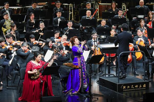 首演以中國傳統(tǒng)民歌為母題,通過“雙獨(dú)奏+大型交響樂團(tuán)”這一獨(dú)特結(jié)構(gòu),依次演出了《沂蒙山》《飛歌》《繡荷包》《花兒》《囊瑪·鍋莊》《對鳥·采茶》《趕牲靈》《跳月》《牧歌》《東北風(fēng)》《漁舟唱晚》《對花》12首新作,構(gòu)建綿延敘事的民族音樂圖景,實(shí)現(xiàn)傳統(tǒng)素材在當(dāng)代舞臺上的再度升華。