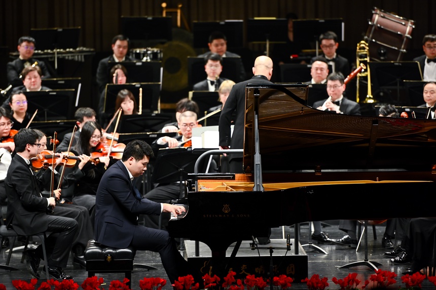 鋼琴與樂團奏響《保衛(wèi)黃河》,鏗鏘有力的琴聲如浪潮奔涌,澎湃的激情與厚重的民族氣魄震撼人心。普羅科菲耶夫《第三鋼琴協(xié)奏曲》以現(xiàn)代性的節(jié)奏張力與抒情段落交織呈現(xiàn),展現(xiàn)出技巧與音樂的深度交融。歌劇《塞維利亞的理發(fā)師》選段《快給大忙人讓路》則以詼諧生動的舞臺表現(xiàn)與敏捷華麗的演唱,揮灑出鮮活的戲劇光彩。特別呈現(xiàn)的二重唱《恐嚇吧,激烈的言辭》(選自歌劇《命運之力》),由兩屆“金鐘冠軍”聯(lián)袂演繹,歌聲中激蕩著命運的對抗與交織,張力迭起,將全場情緒推向高潮。