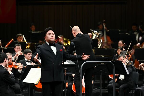 音樂(lè)會(huì)以一曲激昂的《魯斯蘭與柳德米拉》序曲激昂開(kāi)篇。隨后,古箏協(xié)奏《望云賦》以清透靈動(dòng)的音韻勾勒出云卷云舒的東方意境,而歌劇選段《愛(ài)永在》則以深情的旋律吟詠出真摯雋永的家國(guó)情懷。琵琶協(xié)奏《絲路飛天》以繁復(fù)的指法與豐富的音色變化,再現(xiàn)絲綢之路上的風(fēng)物與遐思。《鳥(niǎo)兒在風(fēng)中歌唱》以極具藝術(shù)感染力的演繹,將深切而克制的悲情浸透于每個(gè)音符之中,直抵人心;《苗嶺飛歌》則一轉(zhuǎn)情緒,以清亮悠揚(yáng)的嗓音喚醒山野間蓬勃的生命氣息,宛如晨光穿透層林。鋼琴與樂(lè)團(tuán)奏響《保衛(wèi)黃河》,鏗鏘有力的琴聲如浪潮奔涌,澎湃的激情與厚重的民族氣魄震撼人心。普羅科菲耶夫《第三鋼琴協(xié)奏曲》以現(xiàn)代性的節(jié)奏張力與抒情段落交織呈現(xiàn),展現(xiàn)出技巧與音樂(lè)的深度交融。歌劇《塞維利亞的理發(fā)師》選段《快給大忙人讓路》則以詼諧生動(dòng)的舞臺(tái)表現(xiàn)與敏捷華麗的演唱,揮灑出鮮活的戲劇光彩。特別呈現(xiàn)的二重唱《恐嚇吧,激烈的言辭》(選自歌劇《命運(yùn)之力》),由兩屆“金鐘冠軍”聯(lián)袂演繹,歌聲中激蕩著命運(yùn)的對(duì)抗與交織,張力迭起,將全場(chǎng)情緒推向高潮。