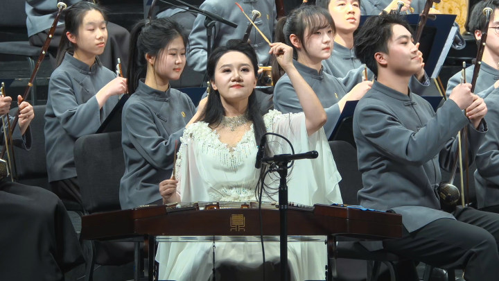 本場音樂會(huì)還帶來了多部作品的全國首演——青年作曲家劉暢創(chuàng)作的揚(yáng)琴協(xié)奏曲《歡歌》由附中青年教師黃煌精湛演繹。作品取材于廣西東蘭民歌,在傳統(tǒng)旋律與現(xiàn)代節(jié)奏之間搭建起富有彈性的橋梁。作為首演,演奏中保留著恰到好處的“新鮮感”,而樂隊(duì)與獨(dú)奏之間的配合,則顯現(xiàn)出長期教學(xué)與排練所形成的高度默契。