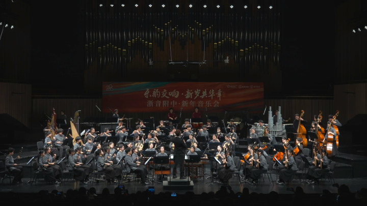 12月28日晚,浙江音樂學(xué)院附屬音樂學(xué)校“樂韻交響,新年共華章”新年音樂會(huì)在浙音音樂廳啟幕。本次演出由浙江音樂學(xué)院附屬音樂學(xué)校與浙音樂典文化聯(lián)合主辦,匯聚了140名師生參與演出。值得一提的是,浙江音樂學(xué)院附屬音樂學(xué)校交響樂團(tuán)和國樂團(tuán)首次同臺(tái)亮相,這兩支樂團(tuán)均為省內(nèi)編制最完整、專業(yè)水準(zhǔn)最高的青少年樂團(tuán)。演出中,西方交響樂與中國民族管弦樂交相輝映,經(jīng)典作品與當(dāng)代原創(chuàng)作品同臺(tái)演繹,充分展現(xiàn)了附中師生的藝術(shù)風(fēng)采與專業(yè)水準(zhǔn)。
