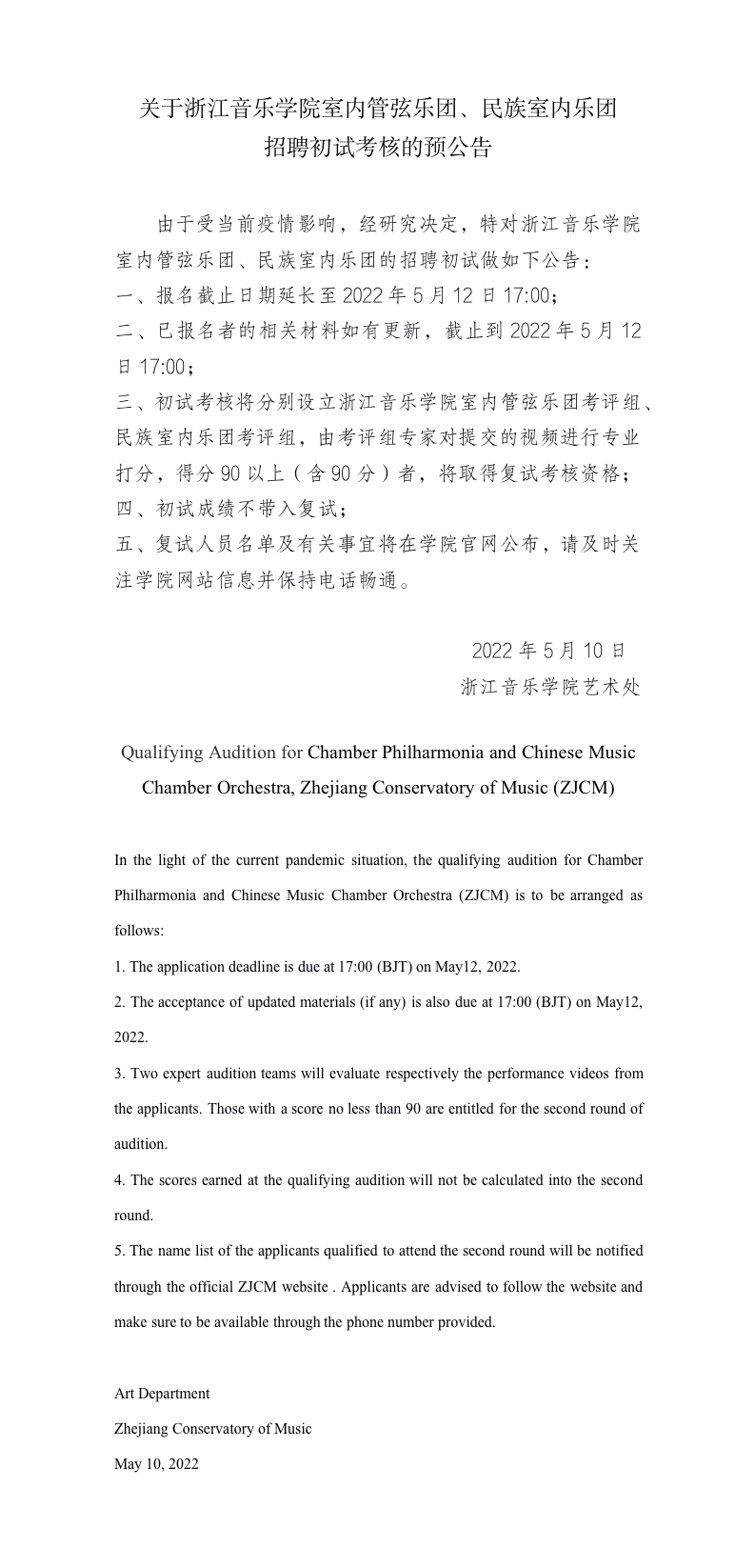 關(guān)于浙江音樂學(xué)院室內(nèi)管弦樂團(tuán)、民族室內(nèi)樂團(tuán)招聘初試考核的預(yù)公告