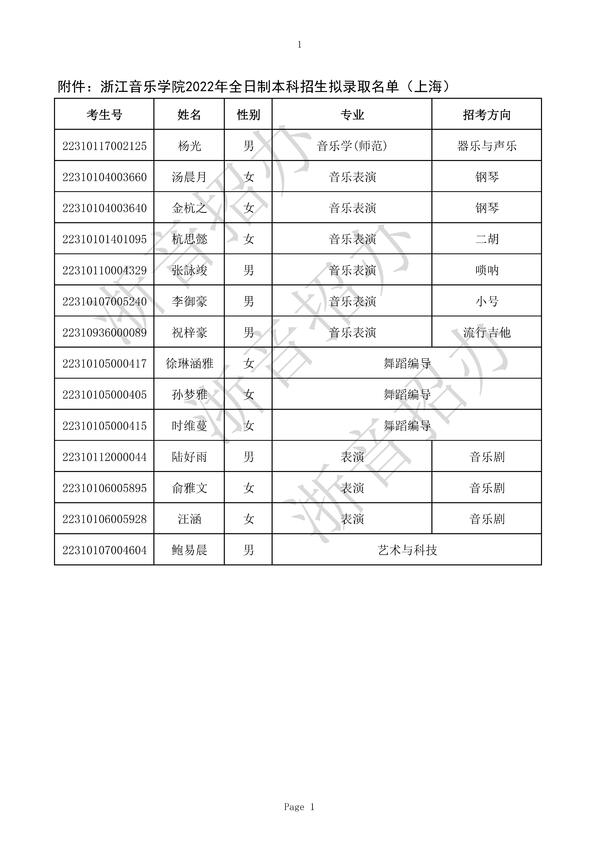 浙江音樂學(xué)院2022年全日制本科招生擬錄取名單(上海市)