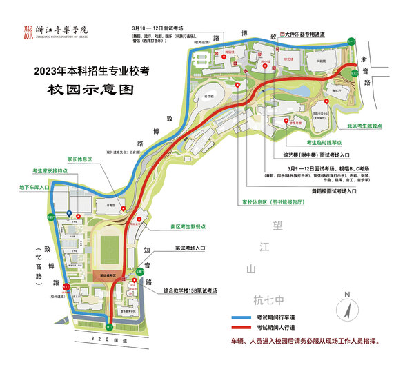 2.如需自駕車輛進(jìn)入考點(diǎn),請(qǐng)聽從指揮,將車輛停放地下車庫,臨時(shí)接送車輛即停即走;學(xué)校周邊交通路況復(fù)雜,請(qǐng)考生及時(shí)了解杭州市區(qū)車輛限行規(guī)定,選擇合適的交通工具提前出行,以免誤考。3月9日—12日,學(xué)校開放東1門、東大門、南門、東南門、西2門,每天早上6:15后考生、家長方可進(jìn)入校園。在綜藝樓(附中樓)、舞蹈樓參加面試考試的考生,建議從浙音路東1門(行車道)或東大門(人行道)進(jìn)入校園;在南區(qū)綜合教學(xué)樓15B參加筆試考試的考生,請(qǐng)從南門、東南門或西2門進(jìn)入校園。如乘坐地鐵6號(hào)線到浙江音樂學(xué)院站,可從知音路“浙江音樂學(xué)院東南門”進(jìn)入校園。