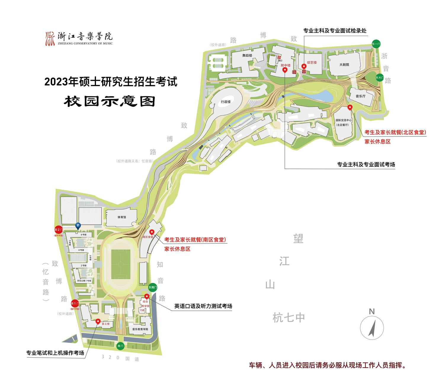 5.如需自駕車輛進入考點,請聽從指揮,將車輛停放地下車庫,臨時接送車輛即停即走;學(xué)校周邊交通路況復(fù)雜,請考生及時了解杭州市區(qū)車輛限行規(guī)定,選擇合適的交通工具提前出行,以免誤考??荚嚠斕?:30后考生、家長方可進入校園。在綜藝樓(附中樓)參加考試的考生,建議從浙音路東1門(行車道)或東大門(人行道)進入校園;在南區(qū)綜合教學(xué)樓15A、15B參加考試的考生,請從南門進入校園。如乘坐地鐵6號線到浙江音樂學(xué)院站,可從320國道“浙江音樂學(xué)院南門”進入校園。