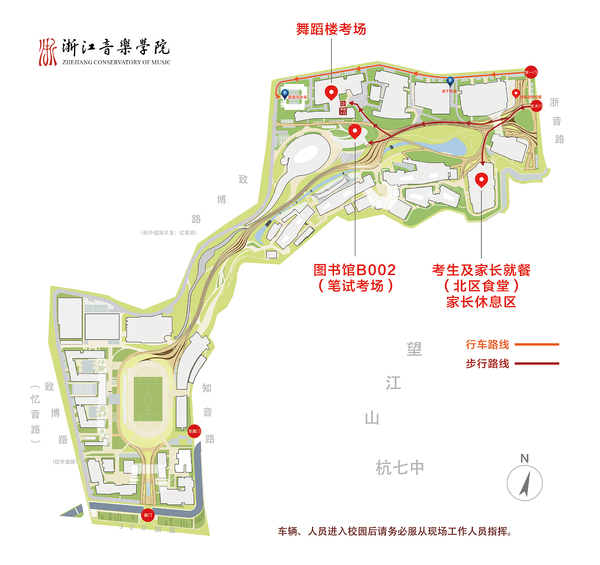 2月2日—3日,學校開放東1門、東大門、南門、東南門,在舞蹈樓參加面試考試的考生,建議從浙音路東1門(行車道)或東大門(人行道)進入校園。如乘坐地鐵6號線到浙江音樂學院站,可從知音路“浙江音樂學院東南門”進入校園(到考場步行約25分鐘)。