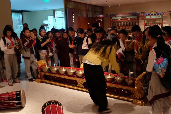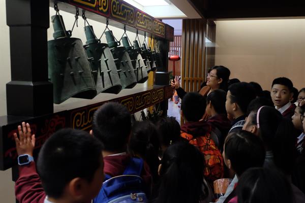 在博物館老師的帶領(lǐng)下,學(xué)生們饒有興趣地參觀了音樂(lè)博物館的四個(gè)展區(qū),認(rèn)真聽(tīng)取了老師對(duì)每一件樂(lè)器的講解,好奇地提出了許多疑問(wèn),還用手機(jī)記錄了各種“新奇”樂(lè)器和它的介紹。在參觀晉候蘇編鐘、曾侯乙編磬時(shí),學(xué)生們積極參與關(guān)于音樂(lè)知識(shí)的互動(dòng)問(wèn)答。在老師的指導(dǎo)下,敲擊編鐘、編磬,細(xì)細(xì)聆聽(tīng)這些古樂(lè)器發(fā)出的美妙聲音。學(xué)生還對(duì)臉譜墻、加美蘭樂(lè)隊(duì)、非洲樂(lè)器等區(qū)域的樂(lè)器十分感興趣。