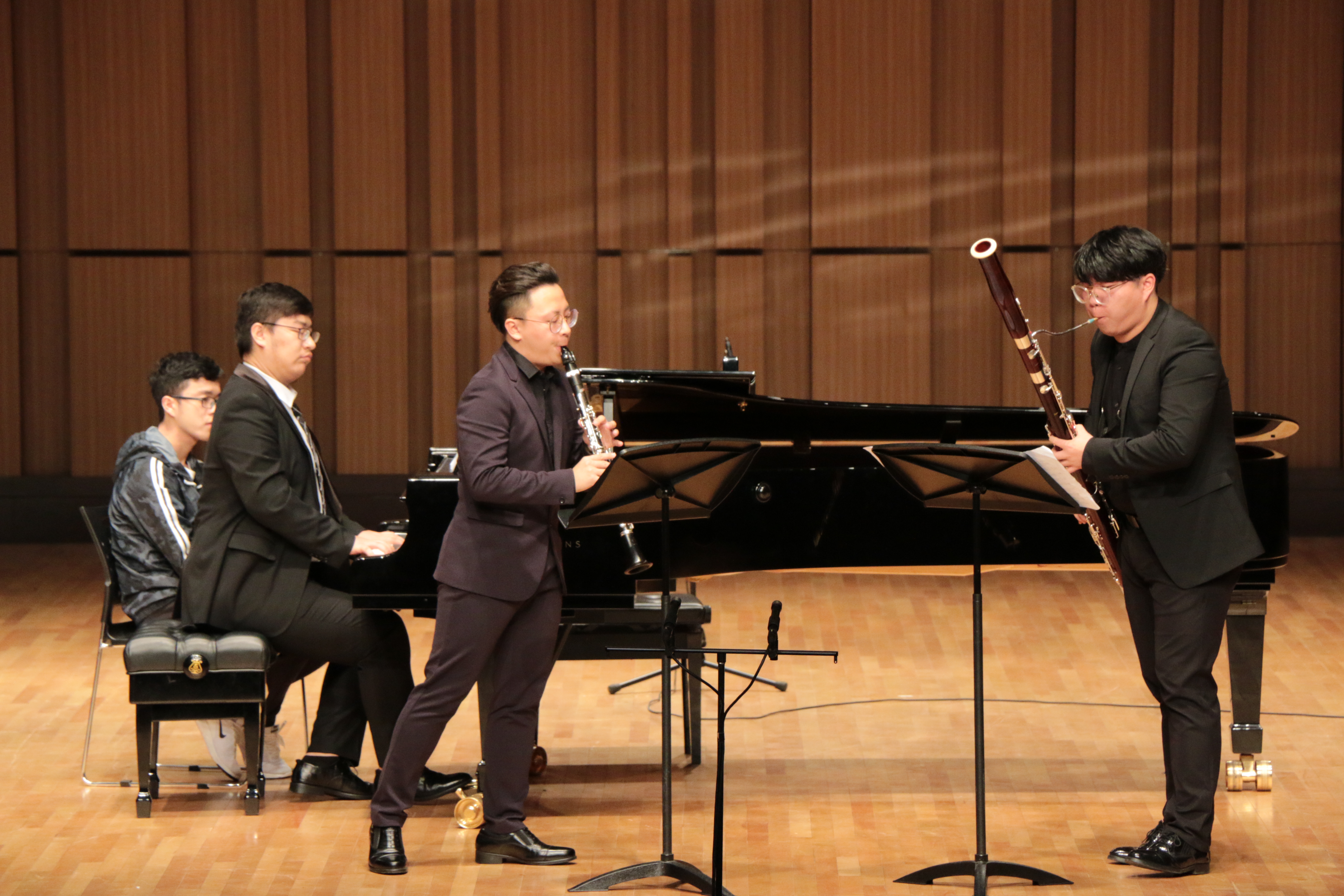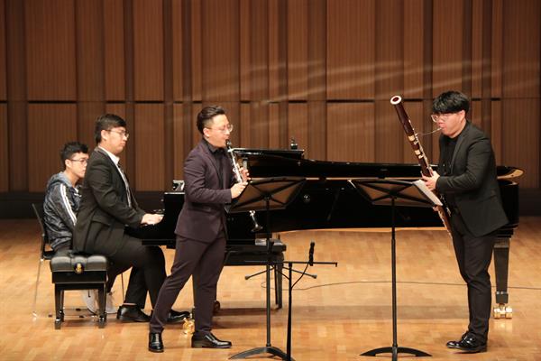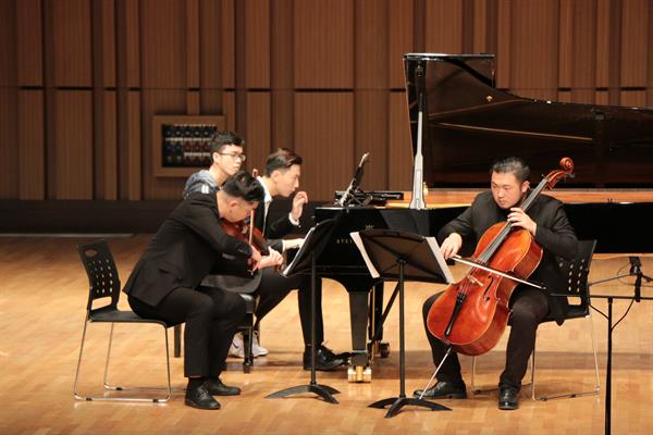 賽場上,席璐臻(單簧管)、陳俊諾(大管)、楊建鵬(鋼琴)等同學(xué)演奏了格林卡的《“悲愴”鋼琴三重奏》,他們默契地配合,豐富地音樂表現(xiàn)力,準(zhǔn)確的音樂風(fēng)格,盡情享受音樂的演奏狀態(tài),贏得評(píng)審團(tuán)認(rèn)可,榮獲一等獎(jiǎng)。葉天男(小提琴)、劉德凱(大提琴)、浦原淇(鋼琴)以斯美塔那的《g小調(diào)鋼琴三重奏》,以及打擊樂專業(yè)解程焜、熊皓和葉慧澤3名同學(xué)演奏的麥克福德《斯達(dá)博尼克》,榮獲二等獎(jiǎng);由劉梓毅、李婉若、金雨軒、劉德凱組成的弦樂四重奏,陳迦南、丁一勍、王抒怡、武亞東、桂子豪組成的銅管五重奏,周子純、席璐臻、許嘉誠、陳俊諾、方一涵的木管五重奏等3組室內(nèi)樂榮獲三等獎(jiǎng)。