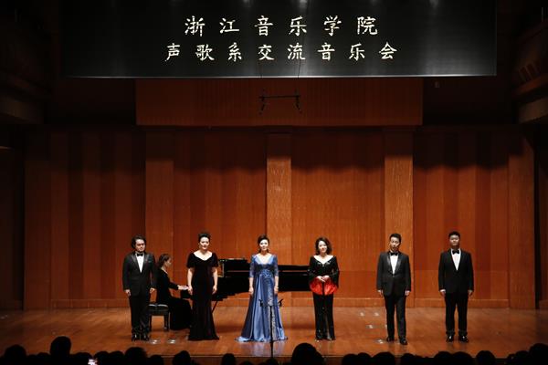 音樂會后,兩院教師在賀綠汀音樂廳的舞臺上圍成一圈,進行了及時的交流。卞敬祖教授認為,浙江音樂學院聲樂歌劇系朝氣蓬勃,年輕教師實力雄厚,發(fā)展勢頭很足。多樣的學術活動、藝術實踐、品牌活動的開展提高了社會影響力,受到了業(yè)界的關注和贊賞。顧平主任對這次交流音樂會進行了充分的肯定,認為這是一場演唱水平很高,學術性很強的音樂會。近年來,兩校聲歌系交流互動頻繁,增進了感情,促進了交流和學習,雙方希望有更多更全面的交流合作。