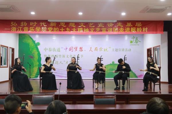 演出中,師生們帶來了精心創(chuàng)編和排演的《紅船謠》《戰(zhàn)馬奔騰》《黃土情》《打虎上山》《放歌新時代》《江山》《羊肚肚手巾三道道藍》《復興之路》《共圓中國夢》等節(jié)目。通過耳熟能詳?shù)淖髌坊仡櫫它h的光輝歷程,謳歌了祖國的飛躍發(fā)展,贊美了家鄉(xiāng)的美麗富饒,從而展現(xiàn)出一幅美好現(xiàn)實與美好憧憬相融一體的優(yōu)美畫卷。秀水泱泱、紅船依舊,民歌《紅船謠》婉轉優(yōu)美,南湖紅船是共產黨夢想起航的地方,開天辟地、敢為人先的紅船精神激勵了一代代共產黨人不忘初心、砥礪奮進;音樂快板《放歌新時代》明快的節(jié)奏令人振奮,同學們用快板說唱的藝術表現(xiàn)形式,歌頌了中國共產黨團結帶領全國各族人民取得的偉大成就,引得現(xiàn)場觀眾喝彩叫好;古箏獨奏《打虎上山》以急速有力的節(jié)奏表現(xiàn)了英雄穿林海、跨雪原,不畏艱險,打虎上山的情景;陜北民歌《羊肚肚手巾三道道藍》一曲高歌,響遏行云,一聲入耳,蕩氣回腸,悠揚高亢的曲調,讓觀眾置身于黃土高原廣闊壯美的情境之中;晚會在浙音二胡藝術研究中心憶江南弦樂團的一曲民樂合奏《戰(zhàn)馬奔騰》中完美落幕。