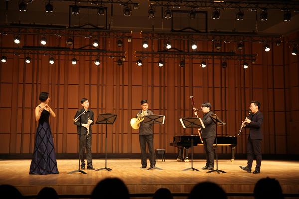 演出形式多樣、學(xué)生們用藝術(shù)表演的方式傳遞出社會(huì)正能量、時(shí)代新聲音。周子純、席璐臻、許嘉城、陳俊若、方一涵等五位同學(xué)組成的木管五重奏帶來的《荒山之夜》,解程焜、熊皓和葉慧澤三位同學(xué)合奏馬林巴《stubernic》,席璐臻、陳俊諾和楊建鵬演奏《單簧管大管與鋼琴三重奏》,李婉若、李安安、韓欣彤和劉德凱同學(xué)組成的由弦樂四重奏演奏了《快樂的薩里哈》,陳迦南、丁一勍、許嘉城、武亞東和桂子豪同學(xué)組成的銅管五重奏演奏《三首吹奏作品》。