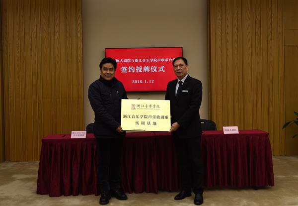 當晚演出前,聲樂歌劇系還與西施大劇院舉行了“浙江音樂學院聲樂歌劇系實訓基地”簽約授牌儀式。諸暨市副市長俞越,諸暨市文廣新局局長何永剛,聲歌系黨總支書記、執(zhí)行主任王維平,副系主任李琳等出席并見證簽字儀式,聲歌系黨總支副書記、副主任張建化與西施大劇院總經(jīng)理項延夫代表雙方簽字,王維平代表聲歌系向項延夫授牌,雙方將本著“校企牽手,誠信為本,優(yōu)勢互補,互利共贏”原則,建立密切合作關系,為師生搭建藝術實踐平臺,豐富市民精神文化需求,提高市民文化藝術修養(yǎng)。