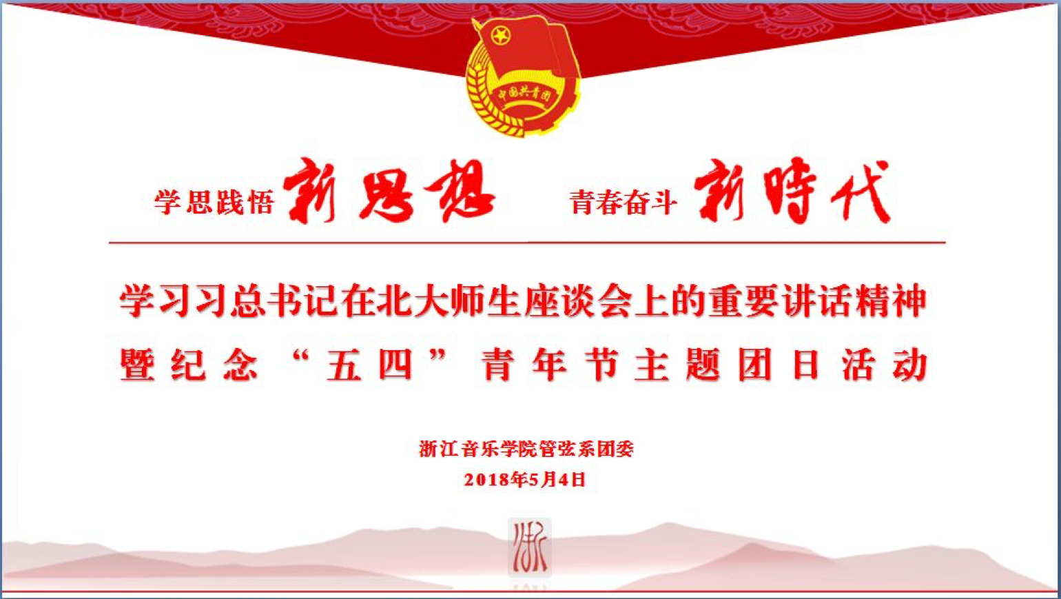 5月4日,管弦系團(tuán)委舉辦“學(xué)思踐悟新思想,青春奮斗新時(shí)代”——學(xué)習(xí)習(xí)近平總書(shū)記在北大師生座談會(huì)上的重要講話精神暨紀(jì)念“五四”青年節(jié)主題團(tuán)日活動(dòng)在DB101會(huì)議室舉行。學(xué)院團(tuán)委副書(shū)記馮宇光、管弦系黨總支書(shū)記琚成明、副主任邸曉嫣、團(tuán)委書(shū)記謝晶,管弦系第一屆團(tuán)委委員、第一屆學(xué)生會(huì)委員、各班級(jí)團(tuán)支書(shū)、獲獎(jiǎng)代表等參加。